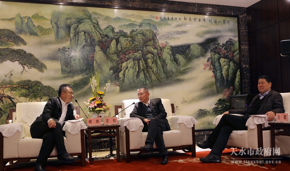 签约仪式前,王锐会见了何亮一行,王锐说,今年以来,天水认真贯彻落实省委、省政府关于全域无垃圾创建活动的决策部署,按照因地制宜、系统治理、标本兼治、城乡联动、共治共享的原则,深入推进城乡环卫领域改革,加大城乡环境综合治理,完善城乡环卫基础设施,不断提高环卫服务精细化水平,城乡人居环境持续改善。这次签约,标志着双方的合作的进入新阶段,天水将营造良好的发展环境,积极支持北京环卫集团在天水的发展。希望北京环卫集团能够充分发挥优势,以环卫装备制造、环境综合服务为重点,为天水环卫服务产业转型升级提供有力支持。